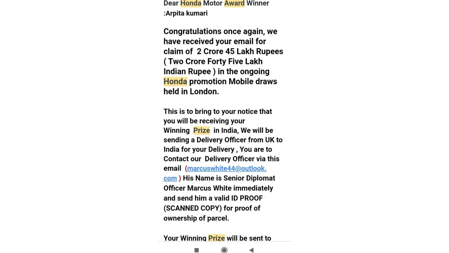 Hlw I had recieved an email from honda motors award winning prize by diplomat