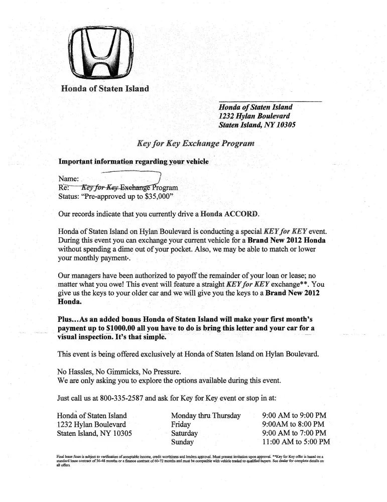 I received a letter Key for Key Exchange Program for my existing lease which is for a Honda Accord 2010 expiring Sept of 2013. According to the letter mail posted on 2/12/2013 the program states they will exchange my "current vehicle for a Brand New 2012 Honda without spending a dime out of your pocket." I made an appt for Sunday, February 17, 2013, a...