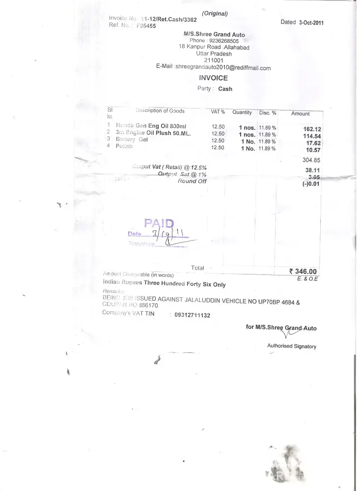 this is to inform you that i (Jelal Uddin) have bought "HONDA SHINE" on 2/sep/2011. All was going fine until i went for my first free service at one of the service center in Allahabad i.e. Shree Grand auto 18 Kanpur road Allahabad (u.p.) their contact number is [protected]. what did they do is without asking me about anything they have charge me Rs.184 extra money for 3m Engine oil Plush 50ml(Rs.114.54), Battery gel(Rs.17.62) and they have also included polish charges(Rs.10.57). on the other hand they also said to me that if you will not add engine oil plush 50ml in your bike engine then i will not give the warranty of engine. they also misbehave with all the costumer by using abusing words.