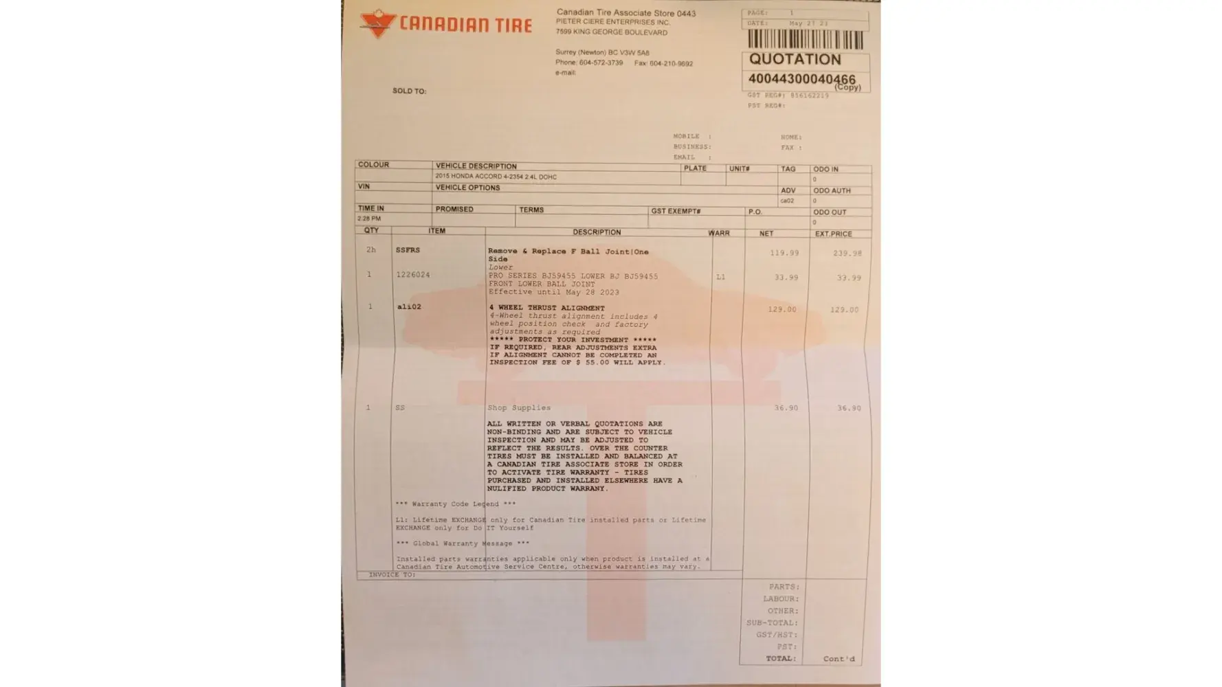 To gain a second opinion and double-check the situation, I decided to take my car to Canadian Tire. To my astonishment, their inspection revealed that the report provided by Destination Honda Burnaby was inaccurate and that the control arm was not the issue. Instead, the certified mechanic at Canadian Tire determined that only the front ball joint needed replacement, followed by a wheel alignment.