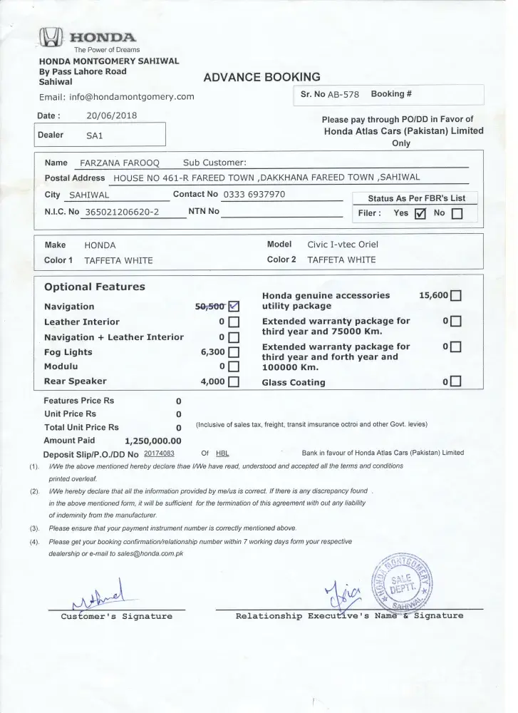 The Car was Booked at Honda Montgomery Sahiwal Pakistan a Honda dealer with Head office
