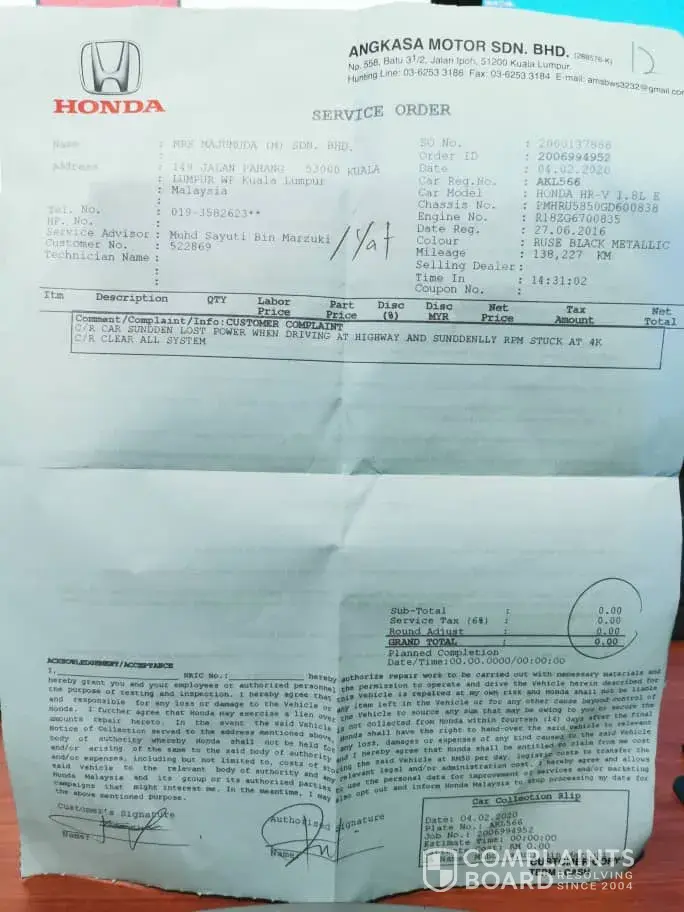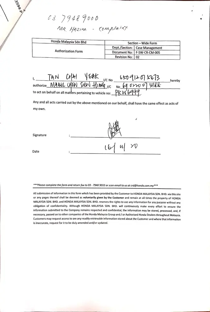 I write this email to you because no any management in Honda Malaysia to help me about problem.