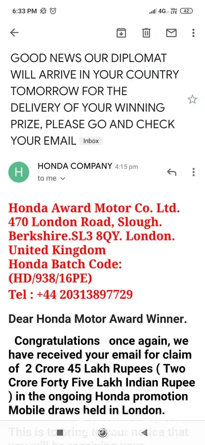 Dear sir, I have received the mail from Honda company. They written that I had got an winning price.and they said that one member of that Honda company was coming to India tomorrow. If he came I can't pay any payment of that product. Sorry sir I had given the details of me and my address. So please forgive me I had done that.please help me.i don't know for which purpose I got that winning price. So please help me.