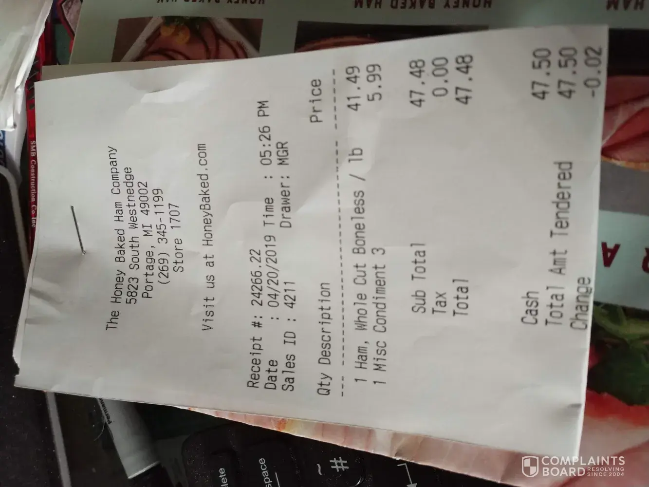 OK, finally got ahold of Honey Baked Hams. They are issuing a refund.