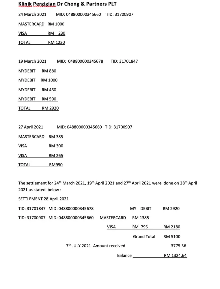 I received partial payment of RM3775.36 on 7th July 2021 after complaining to Merchant Service Department.