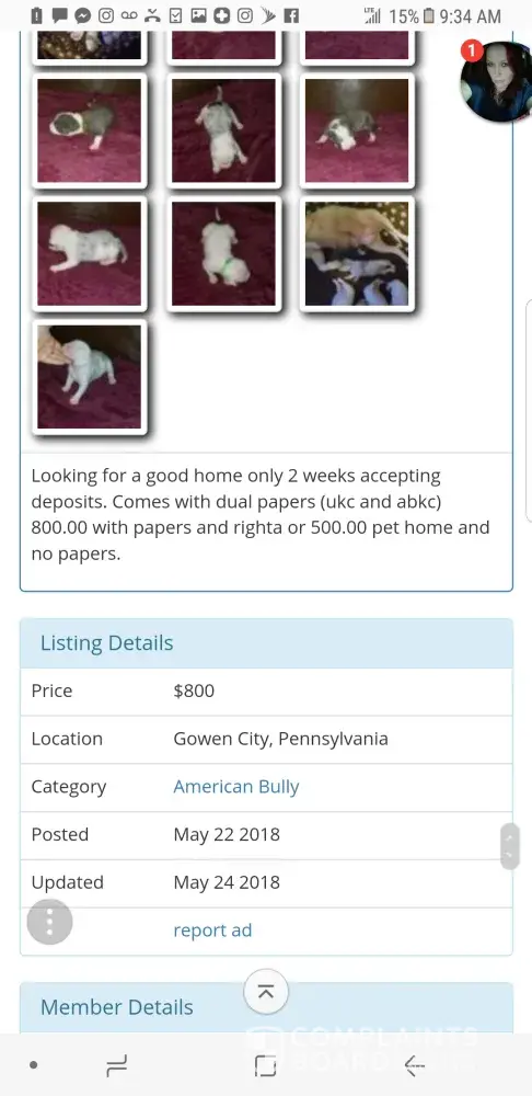 3 of the ads by this user are my dogs they are trying to scam people! Please remove this user and block them before innocent people get screwed over ! I can provide any type of proof you would like that they are my dogs please let me know what i need 2 do I'll add pictures of their post thank you for your help!