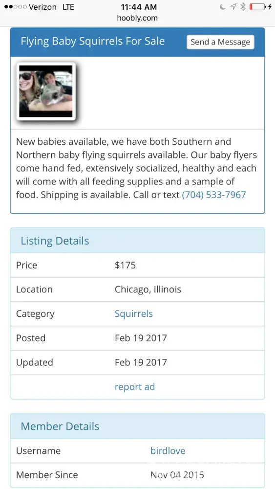 Found an add on hoobly for flying squirrels for sale birdlove was the seller and the phone number to contact was704- 533-7967 I contacted seller and arranged to purchase 2 male southern flying squirrels I was told the sellers name was Roland I was sent pictures and info on the animals I was told shipping was available I told seller I would send money for both squirrels $300 and once the shipping was set would send the additional $150 for shipping fees. The seller was pressuring me to send the shipping money without me receiving any shipping info then proceeded to lie about the shipping saying they would be shipped to my house that day when I never gave the seller my address and animals are not shipped to homes they go cargo the seller told me an airline that does not ship animals to my state would be shipping them and kept insisting I send the money I asked for a refund the seller refused and was demanding money the seller would not send me their vet paperwork which I had told the seller previously I would need for shipping. The seller has not refunded me it was a scam they had no knowledge of shipping animals at all and continued to pressure me for more money the seller also has a facebook add for the same thing