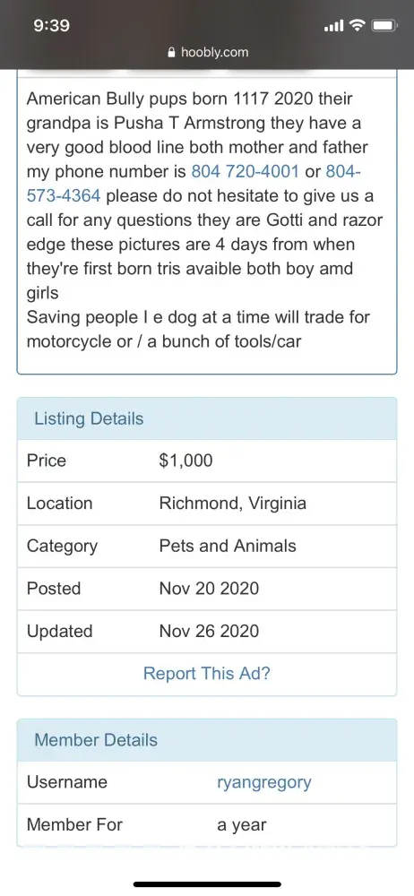 Last year I purchased a dog from user Ryangregory on Hoobly. This was on Feb 1, 2020. His ad listed that they would come with UKC registration papers. When I picked up the dog he assured me that the papers would be arriving in two months from purchase and that he would notify me and mail me the papers. I have followed up with him several times for over a year now. And still have not received any responses. I have contacted him through hoobly and via text. And now I noticed he is selling more puppies and offering papers again. I paid $1000 for a puppy that was supposed to come with papers.