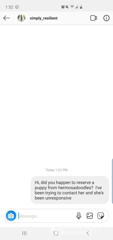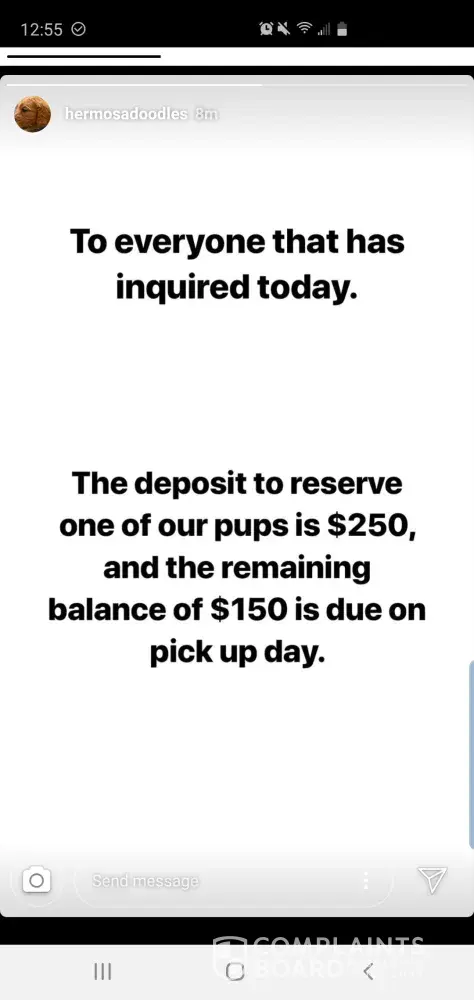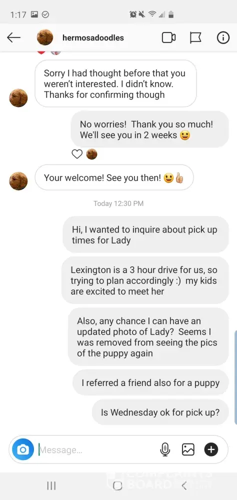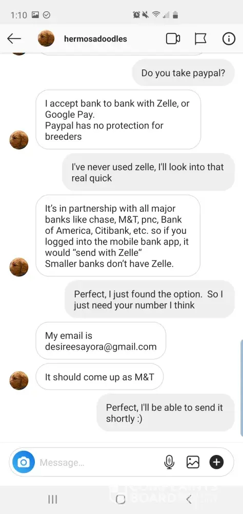 Avoid Hermosadoodles, and the seller in these screenshots on Hoobly. She will take your deposit, then block you. Thankfully I used my credit card through Zelle, so I have buyer protection and am getting my money back.