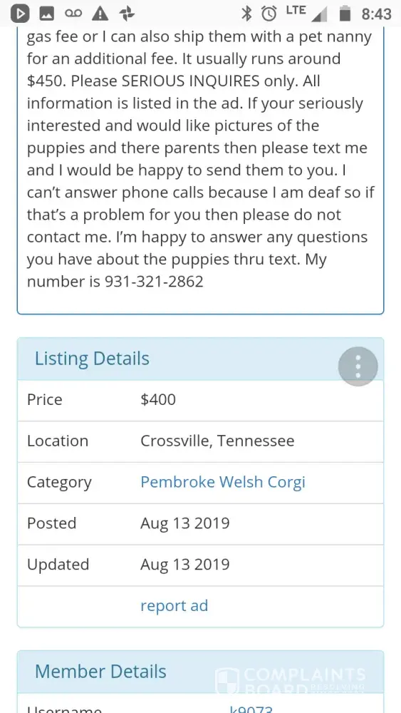 I encountered a person named Courtney Tipton, selling Pembroke/Cardigan cross Corgis for $400, supposedly in Crossville TN. Communicated decently, sent pictures of adorable puppy from an app in which her username was persian20191057. I paid the deposit. She even sent updated pics of "my" puppy. I then found an ad under the same username k9093 at Hoobly selling pugs in Fayetteville NC, with a different phone number but same exact and very specific wording in the ad. Claims to be deaf, so will not take calls. When asked about the pugs, she claims her account was hacked but all these complaints here against her prove otherwise (do a search here for Courtney Tipton). She was immediately defensive when I expressed my concerns and said she'd refund the deposit tonight. We'll see, but everything up to this point has been a lie so I'm sure that is also. I used PayPal friends and family. Big mistake on my part. What a disappointment. She's not just taking people's money, she's stealing their hopes, their eagerness for a puppy, and their trust. Beware anyone with the name Courtney Tipton, email c t i p 2229 (at) g m a i l. Phone number changes according to area she's claiming to sell from. I'm just glad we found out sooner rather than later. I should have known better. Wish I'd googled her name first!