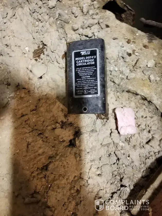 If the repair man took the old parts he replaced, how did the circulation pump cover plate get into the sump pump and positioned directly under the float ball? On one else came into my basement but a delivery man to bring him replacement parts for the pump and water pressure valve. I called Horizon to report this matter, they said they would call me back. I told them I was going to report this to BBB. so far, I haven't heard from Horizon.