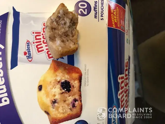 The photo of the mini muffins blueberry featured on the outside of the box is a poor representation of the actual product found on inside. I purchased a box of said product on Thursday, February 10, 2022 from my local Dollar General in Richmond, VA (bar code [protected]). The fluffy-looking, light, and airy muffin displayed on the box was hardly comparable to the dark, flat, overly moist to almost wet, heavy-tasting muffins inside. So very disappointing. Please consider how Hostess can improve the muffin, or whether or not to continue making them. Meanwhile, I will discard these. Thank you for the opportunity to share this complaint. Hostess has many great products, but this is not one of them.