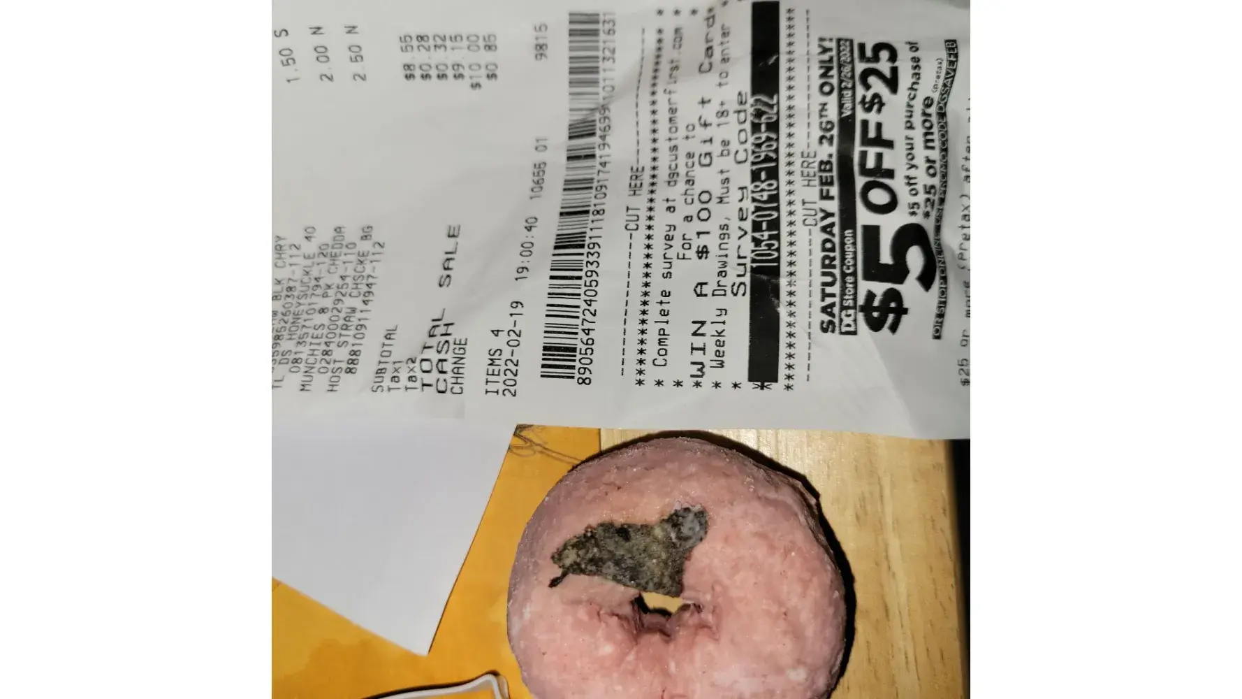 I opened the bag and on a donut is a dark brown bug or poop baked on top of it. It is approx 1 inch in length. I purchased it at dollar general in Byram, MS on 2-19-22, approx 3pm.