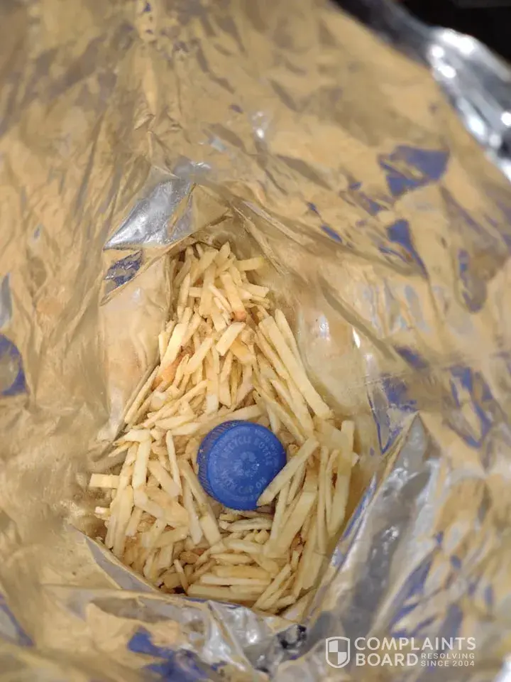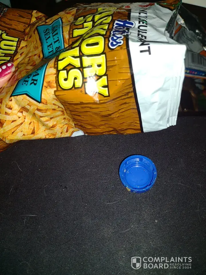 I was eating a small bag of salt and vineger hickory sticks and dug to the bottom to my surprise I had though was a big pile of them stuck together but it was not.. Instead it was a blue bottle cap. I dropped it back into the bag and put it on the counter. I got kids who like to put things in there there mouth what if they were eating the bag they would thought it was okay to what was the cap from did I eat someones spit.