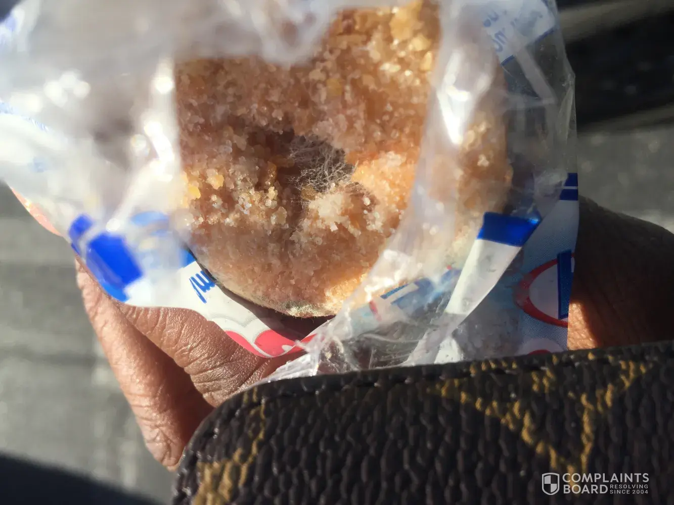 I bought two packs of crumb doughnuts today boy was I excited they are my favorite. I usually look at my food before I eat it but not this time. I ate 1 doughnuts & it tasted weird as if it was sprayed with something then my mouth went dry! I spit it out immediately & looked at the rest of the doughnuts they where all molded . This ruined my day I immediately started vomiting.