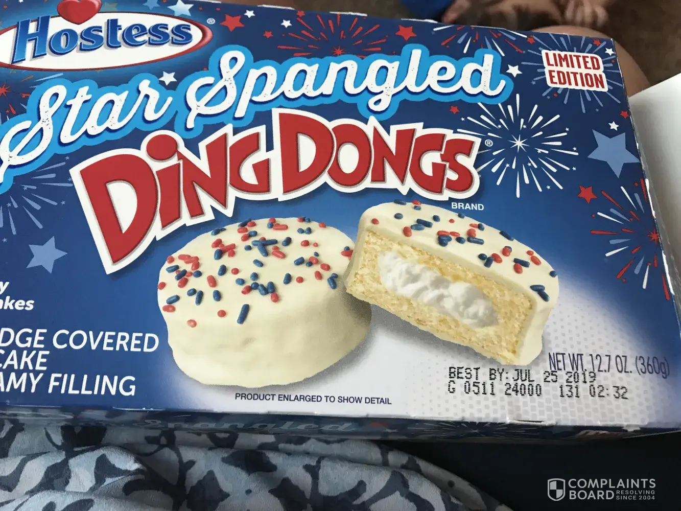 I recently purchased "Star Spangled Ding Dongs" at my local Wallmart. I opened the box today and tried one cake. It was hard, had very ( and I mean just a glaze ) icing and tasted old and chewy.