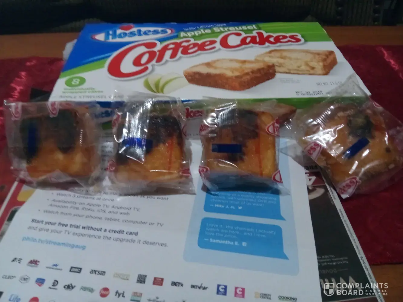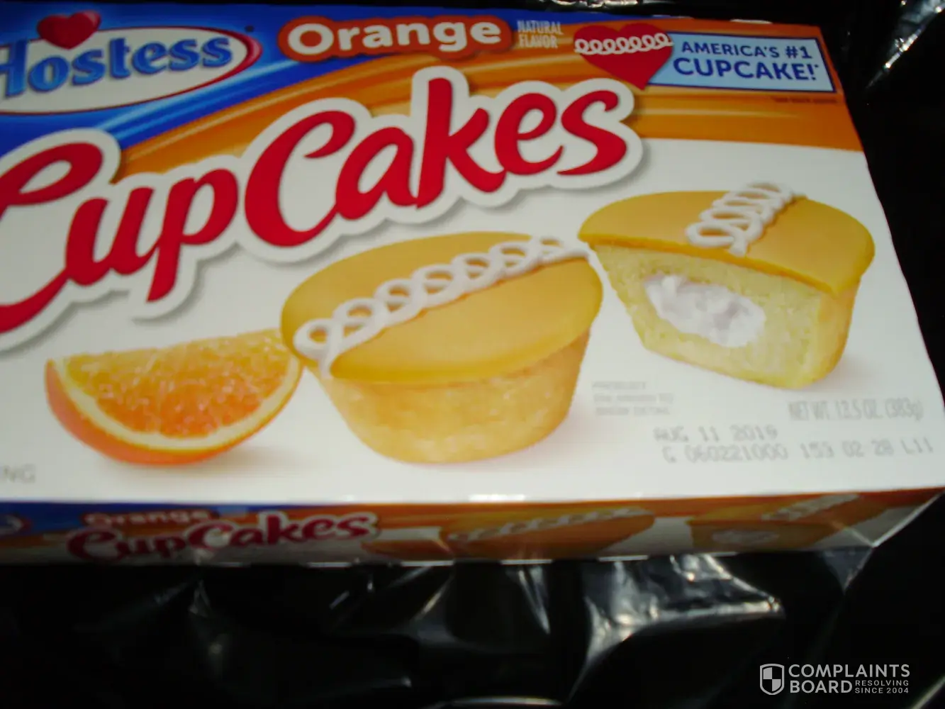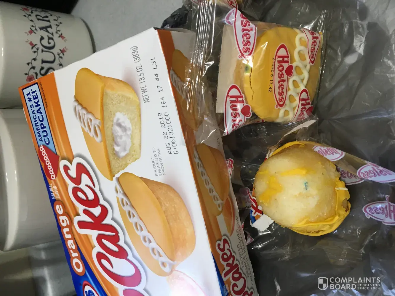 Opened a box of hostess orange cupcakes. Unwrapped one cupcake and notice green spot on bottom of cupcake, looks like mold. I then took the rest of the cupcakes out of box and found a green moldy spot on top of icing, still inside of package. This is unacceptable and I expect to be compensated, for this. Expiration on box was Aug. 22 2019 Would appreciate an immediate response.