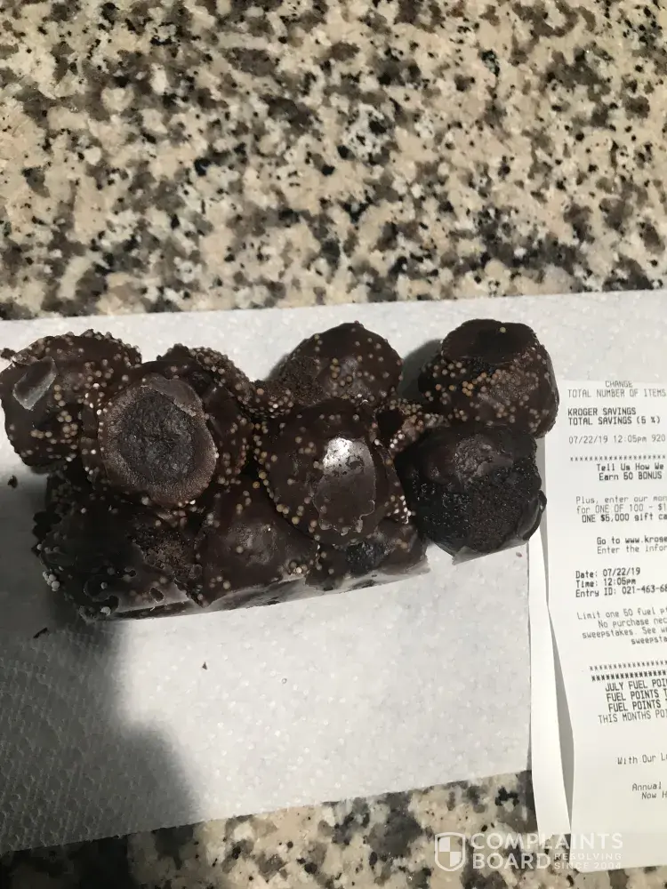 I purchased 2 packages of the bakery petites in double chocolate and strawberries and cream. When I got home and put my groceries away I opened the bag of chocolate to find that they had previously melted and were now back to normal temperature and all stuck together. It's a 10 minute drive from the grocery store to my house so I know they did not melt and then re-harden when I had them. I am attaching a picture of the cake mess and my receipt with the time and date of purchase on them.