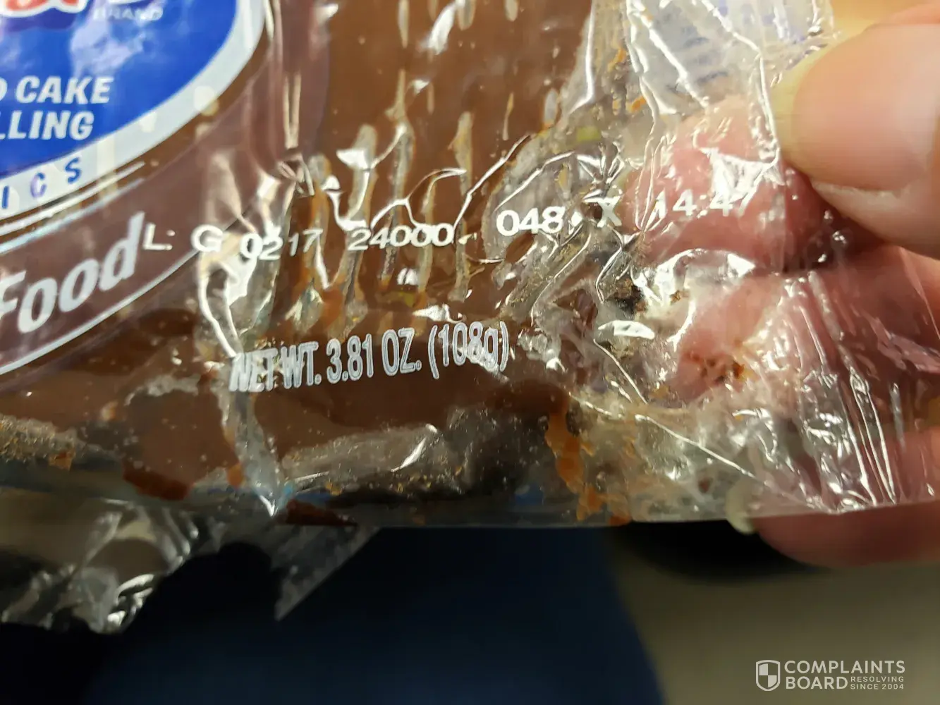 I bought a box of 10 individually wrapped Hostess Ding Dongs yesterday at the Dollar General store in Britt, Iowa, only to find one of them in the box was cut off about halfway through when they packed it. As you can see from the photos, the package is still sealed and there is cake & frosting in the seal. What can be done about this? This is not the first time this has happened and these aren't that cheap.