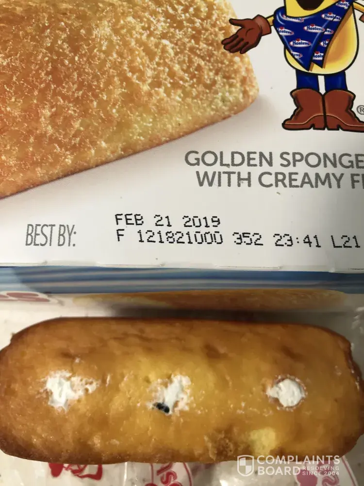 It's a good thing that my husband looks at his food before eating it because there is something black on the bottom of the Twinkie he opened to eat this morning. He isn't the type of person who wants something for nothing, he just wants make others aware of things that have happened and be treated/compensated fairly. I will attach 2 pictures to this email of the Twinkie with identifying markers from the box in which it came from, if any further information is needed please let me know. Thank you