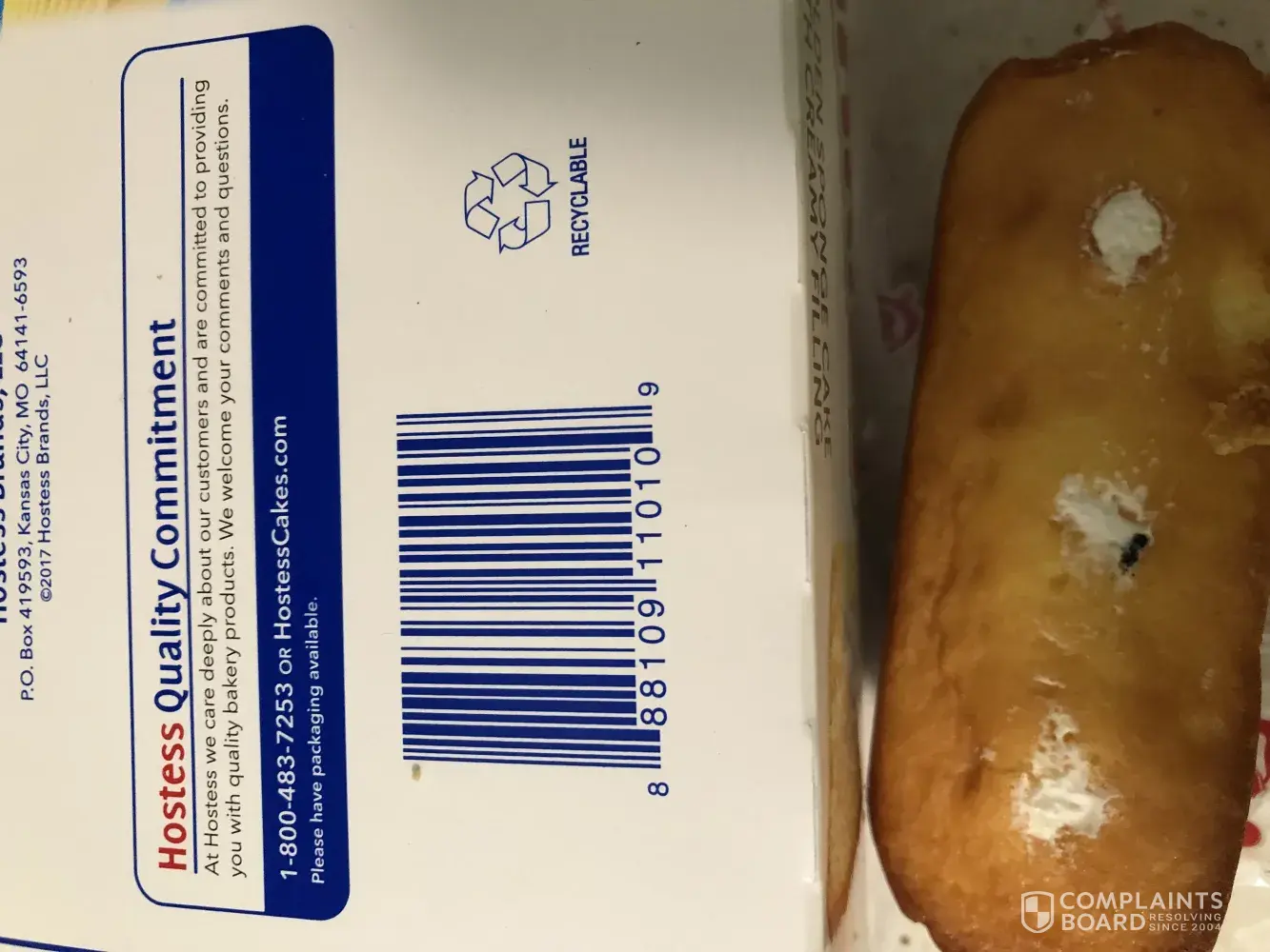 I had recently bought a 3 pack of your vanilla zingers. I had been eating them, when I went to eat the last one, I noticed that there was something dark black that looked like it was baked into the bottom end of it. Enclosed are a few pictures and the information that was on the package as far as date and some kind of a code. I would greatly appreciate it if maybe you could send a coupon for another 3 pack?