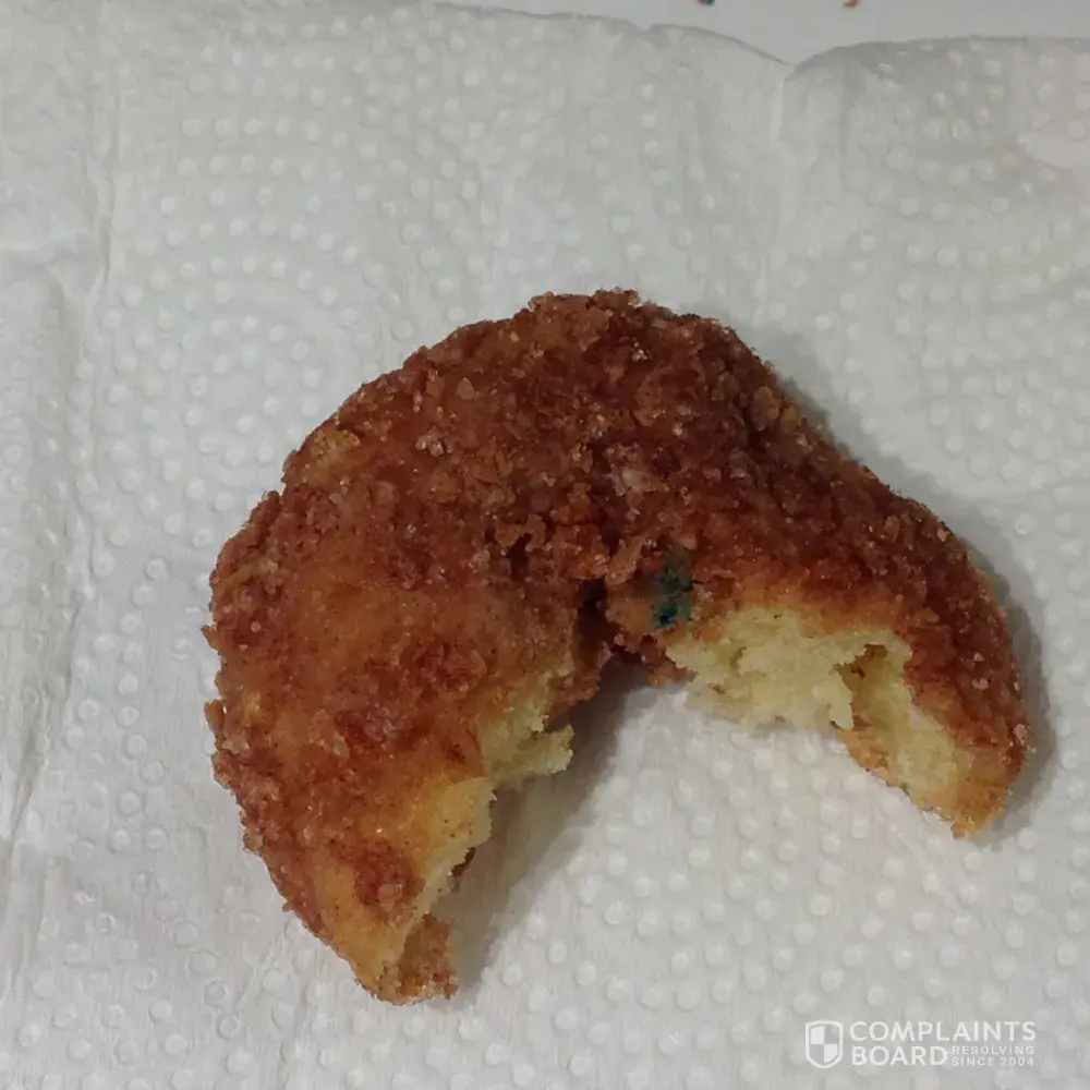 On 11/11/2017 I went to my Walmart and purchased a bag of Hostess cinnamon crunch donuts, went home and got a glass of cold milk and got my bag of mini donettes and took a bite out of the first one and it tasted a little funny, for some reason I took the donut and looked at it and there was a green mold spot on it, I immediately put the donut back in the bag went to the bath room a washed my mouth out and took pictures of the molded donut.