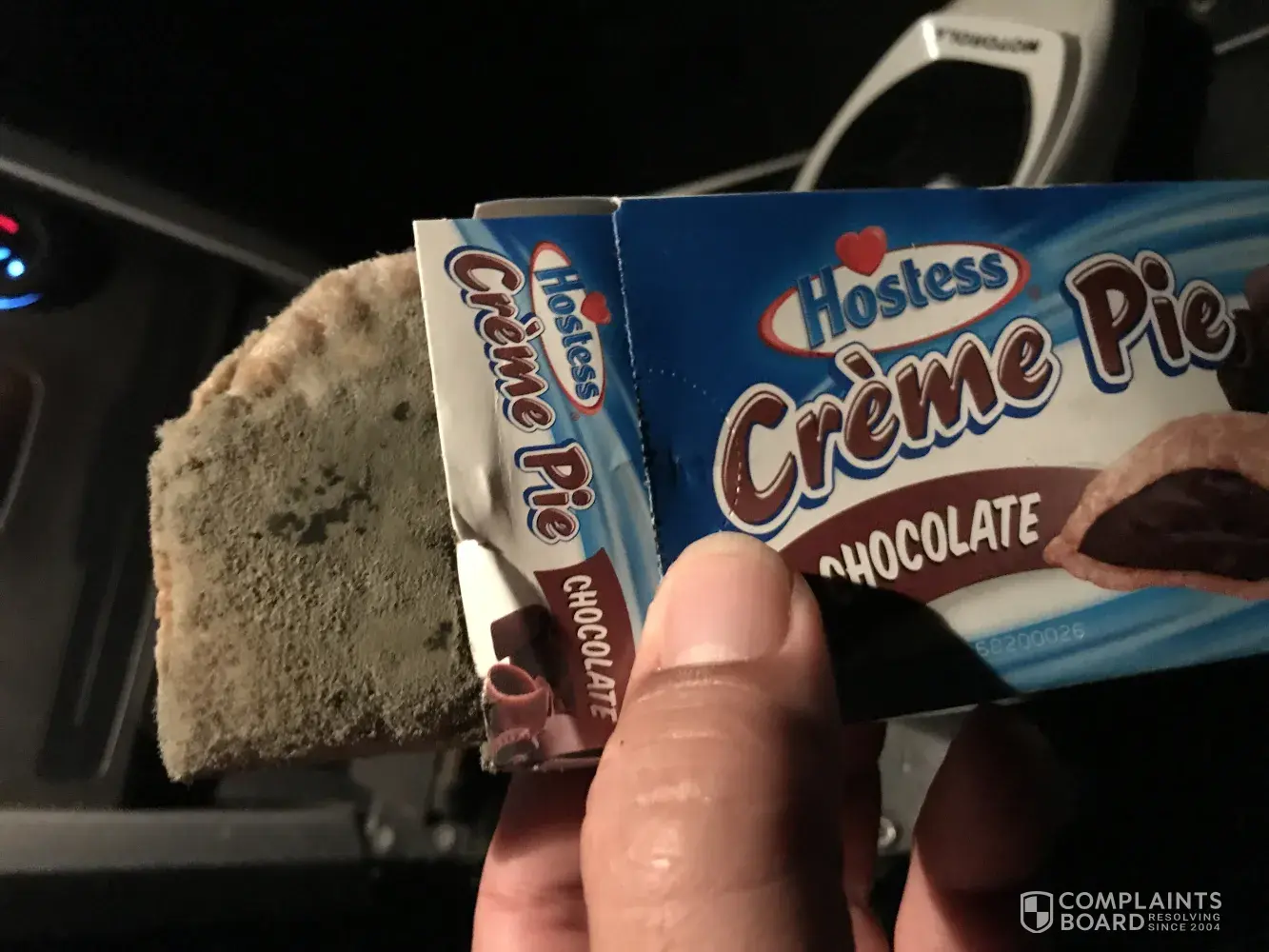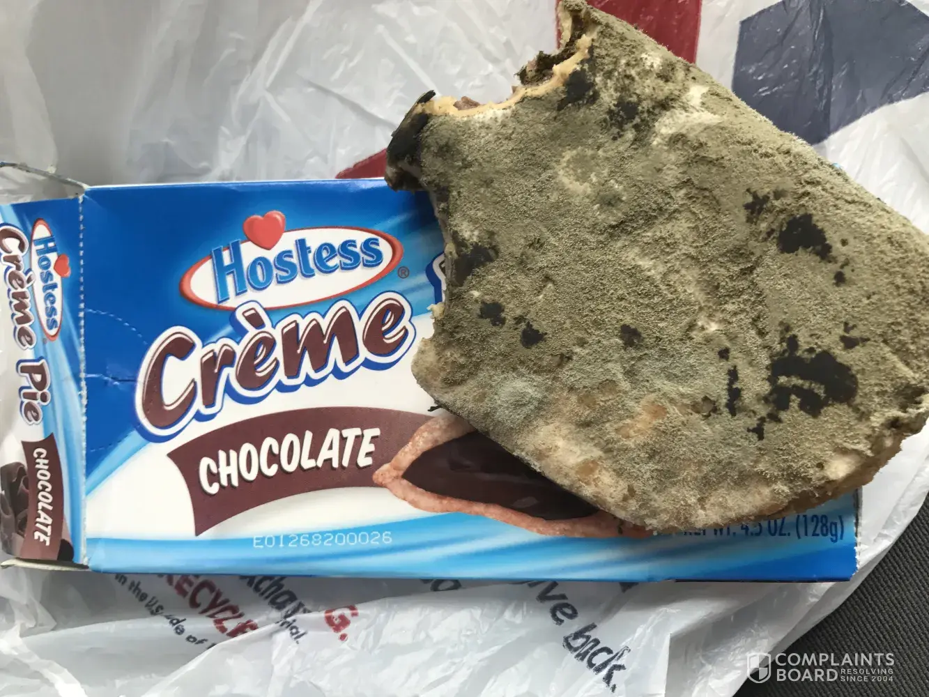 I purchased a hostess creme pie chocolate. I work nights so I was eating it in the dark. I had a drink of coffee with the first bite so I did not realize anything was wrong until I took my second bite. Once I took that second bite I knew something was not rite and turned on the light. What I saw was so bad it made me throw up. One whole side of the pie was completely covered in mold as you can see in the attached pictures.