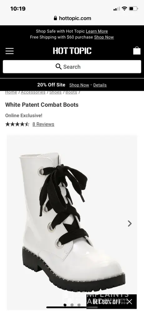 I purchased a pair of White Doc Martins look alike boots from Hot Topic online in Jan 2020. They sent an email saying they went on back order. Then covid came along and I never received the boots. I tried calling them, emailing and to no avail. So I'm out a cute pair of boots Plus my money and they still carry the boots! Very disappointed in the system and customer service. I find it extremely unacceptable And I can't imagine the amount of money they gained and customers lost during this period. Companies that steal from their customers should not be aloud to do business.
