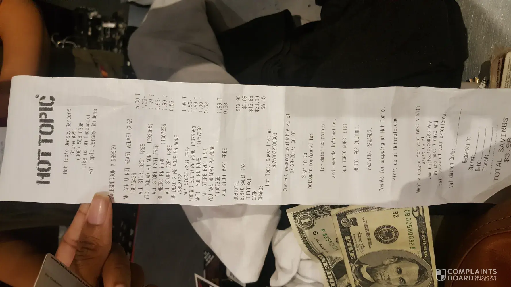 On 7/29/17, I purchased three shirts for my daughter and paid by debit card ($49.80). My daughter came up and wanted to buy six buttons and a choker. I paid for these items with a $20 bill. The total was $13.85, so I received $6.15 back in change. We left the mall and I went to a another store and I attempted to use the $5 I had received from Hot Topic, but was told it was "fake". (the $5 bill and $1 bill were folded within the receipt from Hot Topic.)