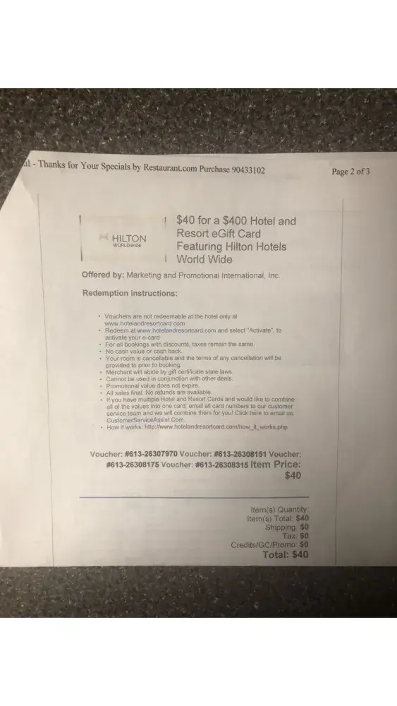 Read full complaintMarketing and Promotional International, Inc - $100 vouchers good towards hotel stays with the hilton hotel chain