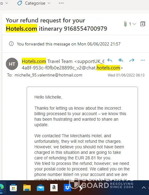 I am complaining due to the service I am currently receiving following a refund I am still waiting on. I have been getting emails from Hotels.com with a fake number to call back to process a refund. however, when I try to request this through the online chat, the agents I speak to advise me to wait further days for a refund to be processed. I have been advised by recent emails to send over relevant information, such as my post code and the date the payment was taken from my account and as such I have, I provided this information. but have not had any correspondence accept to call back on the following number: [protected] this number is unrecognisable it looks like an international number to me and won't let me dial out. I requested via email for an agent to call me back directly instead. and I am still not hearing anything but repeated emails stating ' Hello Michelle,