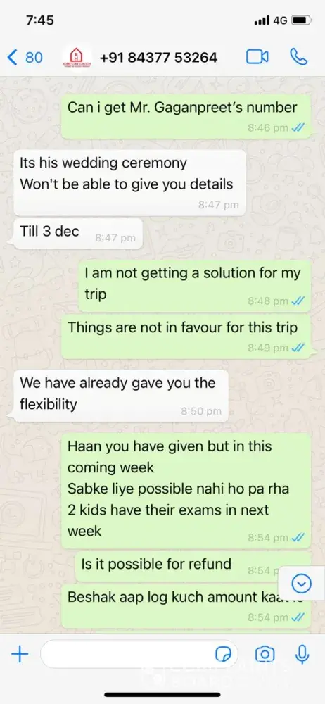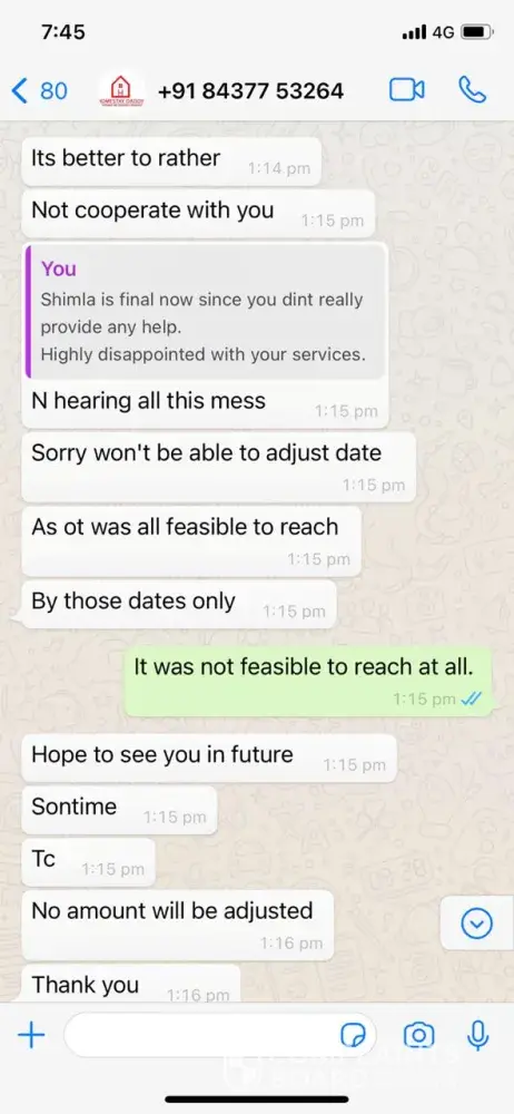 We booked our stay for 8 people and 2 kids at their Casa Vista Shimla property. One day before there was Farmers agitation in Punjab leading to the sealing of borders. Because we had kids traveling with us (one :3 years old and another 4 months old), we requested the team to shift our dates to some other week. The team who did not pick our calls saying she is busy at a wedding and we had to literally beg them to at least chat with us on Whatsapp and confirm if they can either cancel the booking or shift the dates or change the property to some other place. They said they can shift it only to next week and there will be no refund. My brother's family unfortunately got tested COVID positive two days later. We straight away called them for 2 days and requested them to cancel our booking since we were only 6 cousins left now and w head paid for 10. Also asked them to reduce the price accordingly but got no response. Tried whatsapping them to at least be a little understanding of the situation wherein we had 4 teenagers now and 2 adults. We had to somehow manage our travel on 5th December. Once we reached Shimla, the rooms were not cleaned properly. There was no water supply and we were told to use water judiciously. the furniture was dirty. The kitchen did not even had basic sugar or tea or salt. The staff who was in touch with us over whatsapp chatting (did not pick our calls and said she's in a wedding for over one week by now and did not give us her owner's number so we could discuss). We had also asked them for their help for arranging a cook to which she said there will be a cook/caretaker who takes 200 Rs or so per meal and will cook for you but he clearly refused and said he's working as household maid somewhere and doesn't have time. We tried getting in touch with team but in vain because they were not available on calls and continuously tried shunning the situation. Moreover, we see in the news that Shimla would remain closed after 8 AM-8 PM and on Sundays. When we discussed this with the team she said there is nothing like that. We told her clearly that we are arriving on Sat and will leave on Monday because we are employed and have our office. If we are coming for holiday, we might as well enjoy at least but because of no support given we told them we are disappointed with their services. Looking at that message, instead of calling us as their customers or supporting this, Aarti msgd us and said your booking is cancelled and we will not refund your money as well. Do whatever you want. I'm highly disappointed with wasting money on this stay during this trip. It was not just a waste of money but fraud on their part.