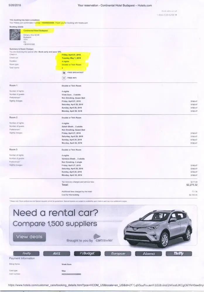 1. I had done the hotel booking for our Budapest visit through Hotels.Com, for Continental Hotel Budapest. As per Booking [protected] (attached separately as Book1), I had booked for 4 nights and 3 rooms from April 27, 2018 to May 1, 2018., with the total payment of $2, 275.32. Since, 2 of our members, Mr & Mrs Satish Sheth, were reaching Budapest on April 26, 2018, I had done separate Booking [protected] (attached separately as Book2-Original) for 1 night and 1 room for Mr & Mrs Satish Sheth, with the total payment of $223.27. However, by oversight, the dates used for the booking were May 26, 2018 to May 27, 2018 instead of April 26, 2018 to April 27, 2018.