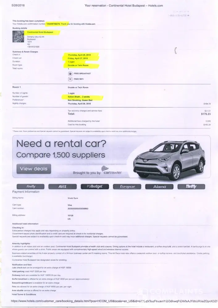2. When I realized the date mismatch, contacted your Customer Representative on April 22, 2018 at [protected]. She checked the availability of the room for April 26, 2018 and offered a room at the same Hotel for $176.23, vide a revised Booking [protected] (attached separately as Book2-Revised). I requested credit for $223.27 for the earlier booking, as it was only change of dates and not the cancellation of the booking. She informed that Hotels.com has no objection for the refund but has to get the approval from Continental Hotel Budapest. After keeping me on hold, she informed that Continental Hotel Budapest refused the refund. Thus, I was additionally charged $176.23.