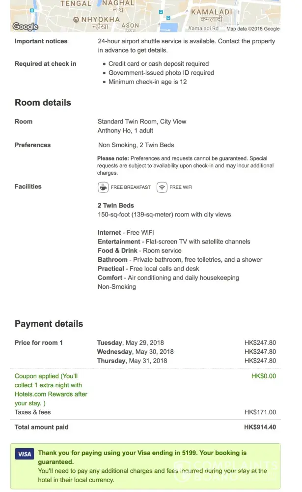 [removed]: I was physically at the hotel the day of my booking and took picture to show that hotels.com did mislead me.