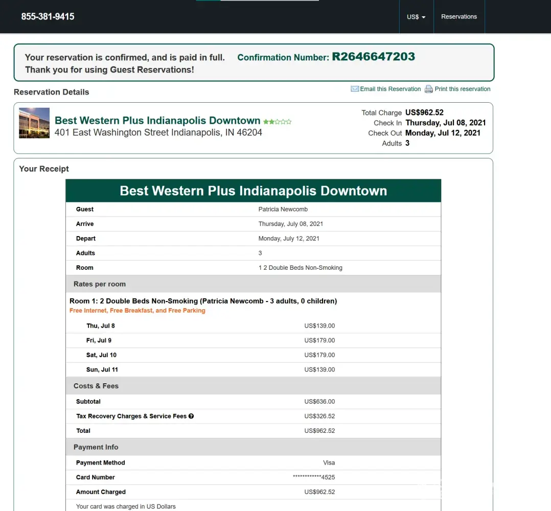 I thought I was booking a hotel room at Best Western Plus in Downtown Indianapolis from Best Western Hotels' direct website. I had to move quickly and did not realize that I was being charged nearly $350 over the Hotel's actual rate. The additional fee was called "Tax Recovery Charge and Additional Fees". I expected there to be some head tax but nothing like that.