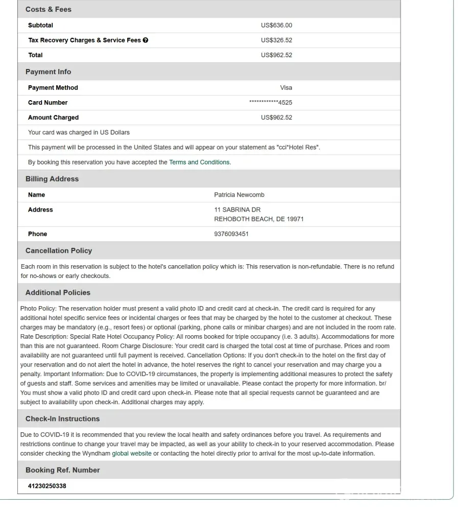 I searched the web for the best possible price I saw the hotelvalues.com advertised a room listed at 125.00 us dollars which seems reasonable, prior to booking I called the same hotel for pricing and there were 149.00 us dollars if have done it in person or over the phone directly to the same hotel since I'm on a fixed income and the pandemic problems I tried to save some money. I filled out the required reservation form and submitted it along with my credit card for payment, a few minutes later I received the confirmation number and a summary of the charges which there were way too much different from what I had made the reservation. They charged 149 00 plus 88.00 in taxes and fees total bill of 229.00 normally bed tax fees in a hotel would it be between 20.00 and 28.00 us dollars that extra fees that they imposed were never disclosed in the pre-booking reservation including the non-refundable cancellation they disclosed the nonrefundable reservation policy after the fact, once you submit the payment and booking reservation. I immediately called the company to cancel, they said that I could not cancel. This deceiving practice is unacceptable this company has numerous complaints on the same issues I believe that this company should be blocked and ban from doing business they should be stopped before they continue to scam more innocent people.