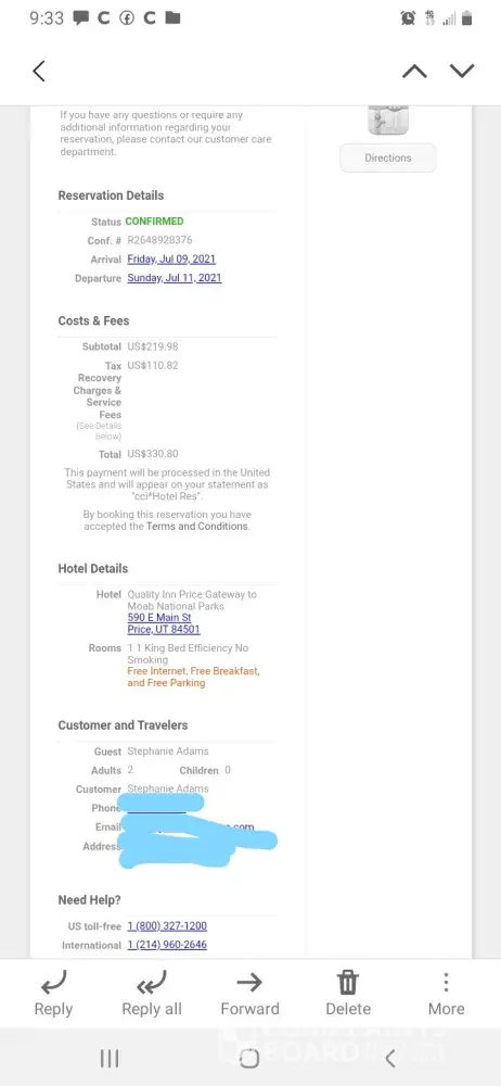 He kept saying that when I gave my email address, I agreed to the charges. I told him I wouldn't have agreed to that. Also, on my Reservation Confirmation email, it doesn't even show the room rate - only a Subtotal of $219.98 - which isn't even the total of the Room Rate plus Tax! Then it adds the $110.82 in fees! The phone number for them is [protected]