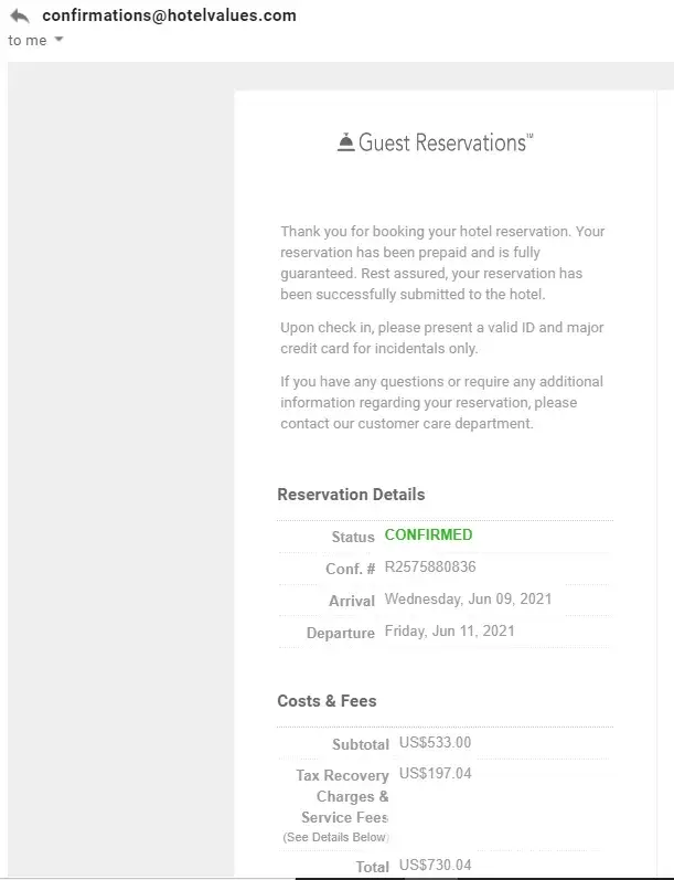 I booked a room and received a confirmation from Hotelvalues in USA.
