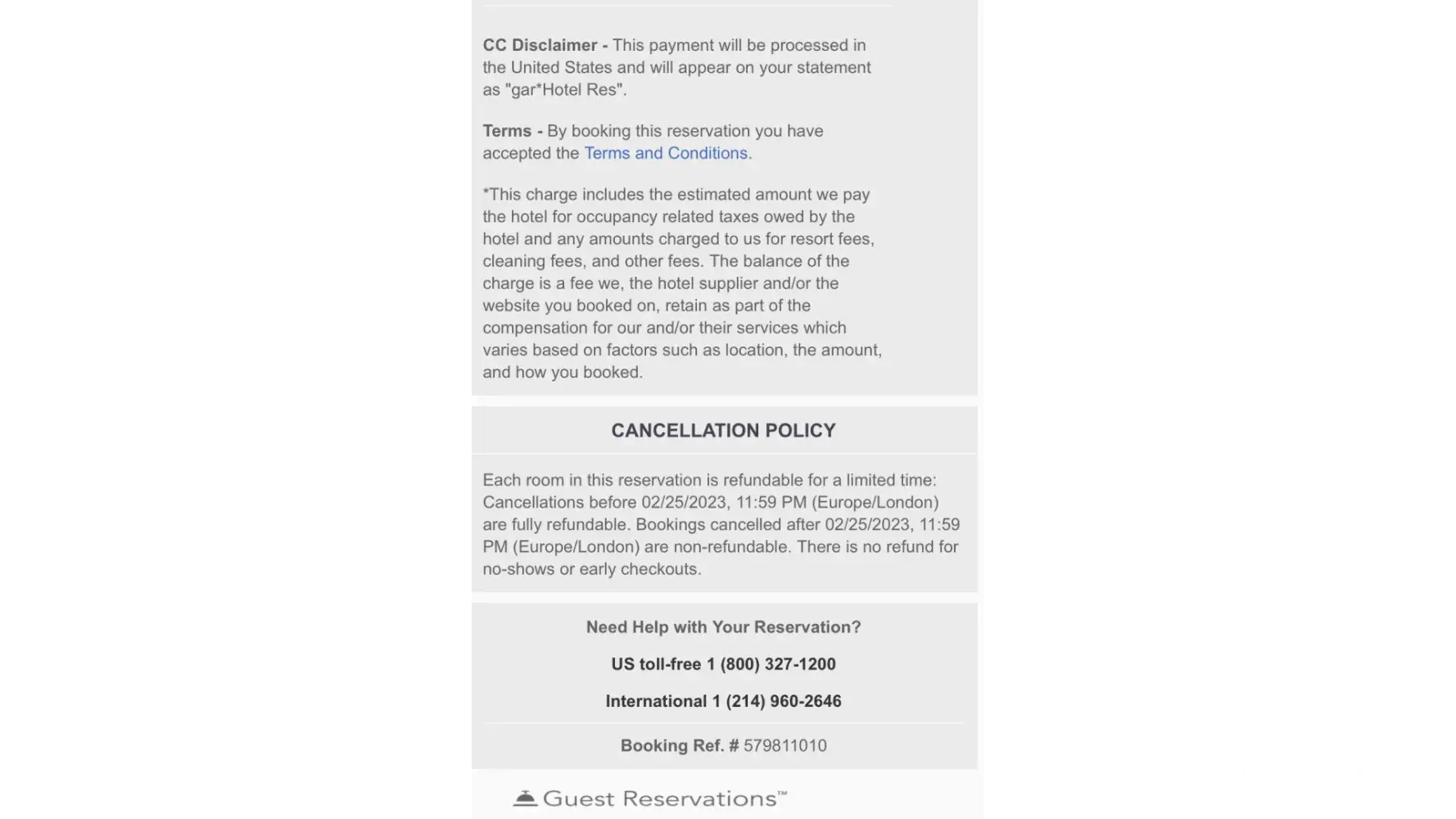 CC Disclaimer - This payment will be processed in the United States and will appear on your statement as "gar*Hotel Res".