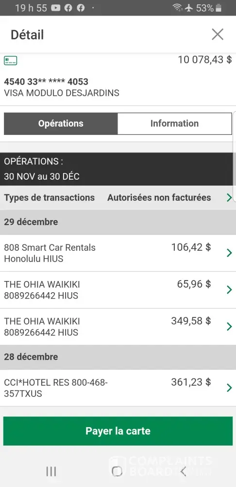 A charge for $211.17 made for room service at Hyatt Hotels for December 12, 2023 and no evidence of payment to Hyatt account shown . Request full reimbursement.