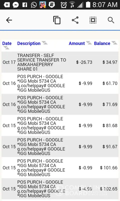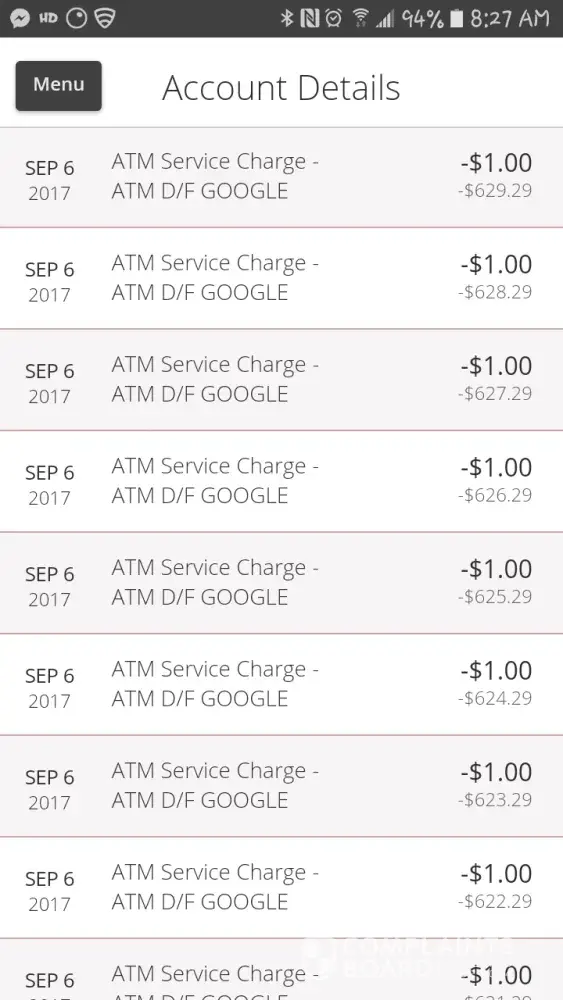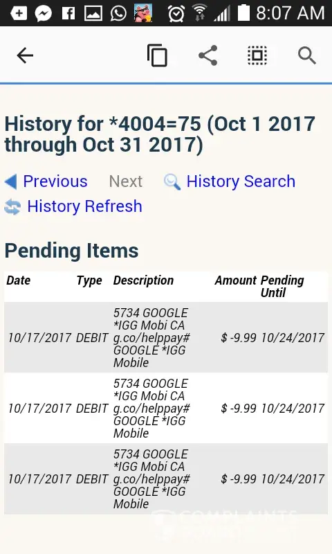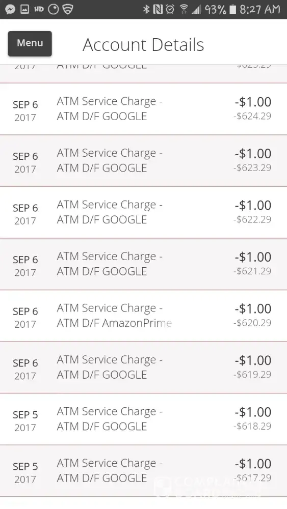 Five transactions for checking account. Transaction for Google Services. Pending on 9/22/2018. Unauthorized checking account.