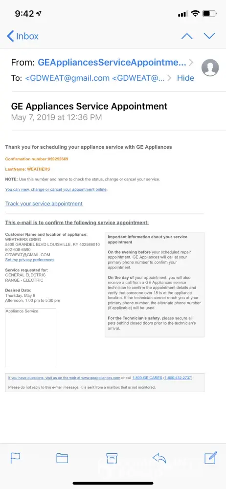 My family has been without an electric range now for a month and a half and continue to go without one due to the horrible customer service and poor technician work done by GE. Our electric range became inoperable on May 6th. I called GE May 7th to schedule a technician appointment for May 9th between 1:00pm and 5:00pm. On May 9th, the technician was a "no call, no show." I called GE May 10th to find out why no one showed for our appointment, and was told that there was nothing in the computer for our address (attached screenshot shows the email confirmation). During that call, I was told "there are some technicians in your area today, I can have someone out there today" (on May 10th). About an hour later, another person called and said that the technicians couldn't make it today, and wouldn't be able to come out until Monday, May 13th. On May 13th, a technician named Keith ran a diagnostic test and said the problem was the mother board. Keith said he would order the new mother board, and scheduled another appointment for May 21st for the installation. According to Keith, a new mother board and the installation would be approximately $500 since we did not purchase the extended warranty. Keith also gave me his telephone number in case we needed to change our appointment. Although Keith scheduled our appointment for May 21st, he showed up on May 20th when no one was home. Again, we had to call customer service to find out why he showed up on the wrong day. The person my wife talked to was very rude, and let us know that a training may have been scheduled after Keith made our appointment; therefore, the appointment had to be changed even if it was an inconvenience for us. We made another appointment for Wednesday, May 22nd. On May 22nd, Keith installed the mother board. As we pushed the range back in place, we heard a spark. We pulled the range back out and Keith removed the back-metal plate to expose where the power cord was installed, and discovered that the power cord had somehow melted through the plastic bracket that held the power cord in place. Keith then said he had to order more parts. I specifically pointed out a red cord that runs up the back of the range and mentioned that the red cord would probably have to be replaced, and Keith said "no, that cord is fine" (picture of the cord is attached). Keith ordered the parts that he felt needed to be replaced, and rescheduled an appointment for Thursday, May 30 to install the new parts. On the morning of May 30th, I called the automated system to determine if my appointment was for the morning or afternoon. As a result, I found out that yet again we had no appointment scheduled. I called customer service to speak to someone in the consumer relations department to inform them of our GE experience and our issue with scheduling appointments. The customer relations representative I spoke to was Shanta. She contacted Keith to ask him about the appointment he scheduled for us (the only reason she was able to contact Keith was because he gave me his number). Keith denied making the appointment (even though he ordered parts for us that were delivered to our house), but said he would contact me after he finished with the service call he was on to see how he could fit me in that day. Keith never called. I called consumer relations again after a couple of business days. Again, I let them know about our unacceptable GE service experience and how unhappy we were with the lack of customer service. I also told them that I didn't want the same technician (Keith) to return to my house. We scheduled an appointment for Thursday, June 6th. Another technician came to install the parts Keith ordered, and quickly realized the we also needed a new 4-prong power cord (which Keith didn't mention), and the red cord that I mentioned to Keith - also needed to be replaced. The technician said he would order the additional wire that runs up the back of the range, and told me to purchase the 4-prong plug. The technician also rescheduled us for Friday, June 14th. On Thursday, June 13th, I received a voicemail from GE saying that the part is on back order, and the earliest someone could install the part is July 1st.