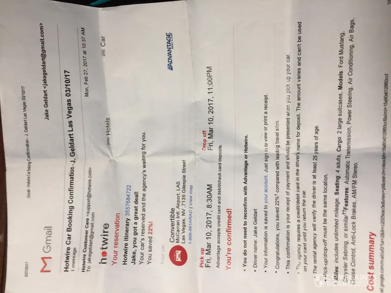 I had a horrible experience with trying to pick up my rental in Las Vegas. I had booked to pick up my convertible Ford Mustang or similar for 8:30am. When I arrived at advantage car rental, they told me they didn't have a car for me and I had 2 options, wait for Potenialy 2hrs or go somewhere else to get one? I said what? They didn't give a ### and said even if they had a car it would have been a beetle converatable ? When I booked the website said it would be a Ford Mustang or similar ? Anyways, even if it would have been a bettle, I would have been fine with it, but they never even had one. I had to go to enterprise and rent a converatable that ended up costing me $265 us . It was complete ### and a ###show that ended up taking most of the morning, past 11:00am. I would like to know what Hotwire will do to make it right? I have used Hotwire in the past and will continue if I'm compensated ? I look foreword to your reply. Thank you.