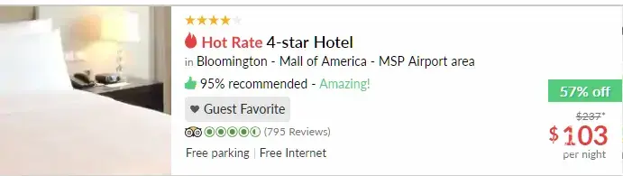 After hours of searching for the cheapest 4-star Mall of America (MOA) hotel rate, I finally settled on the "hot rate" listed by Hotwire.com of $103 nightly. This special rate was stated as a whopping 57% savings over the standard room rate for this hotel of $207. I was thrilled to lock in this Fri - Sat night rate at a MOA hotel, especially since it's the first time in a decade that I get to celebrate my birthday alone with my husband all night - without children! Sadly, my thrill quickly turned to disgust.