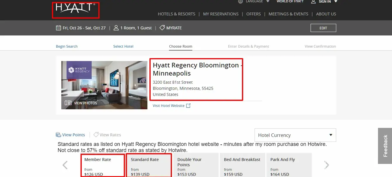 After discovering the falsified distance, I immediately navigated to Hyatt's official website and found the standard average weekend room rate of $129 - which is EXTREMELY cheaper than the falsified listed standard rate of $237 by Hotwire. In fact, I only saved $26 over Hyatt's given rate - and ended up paying more overall by using Hotwire after fees were included.