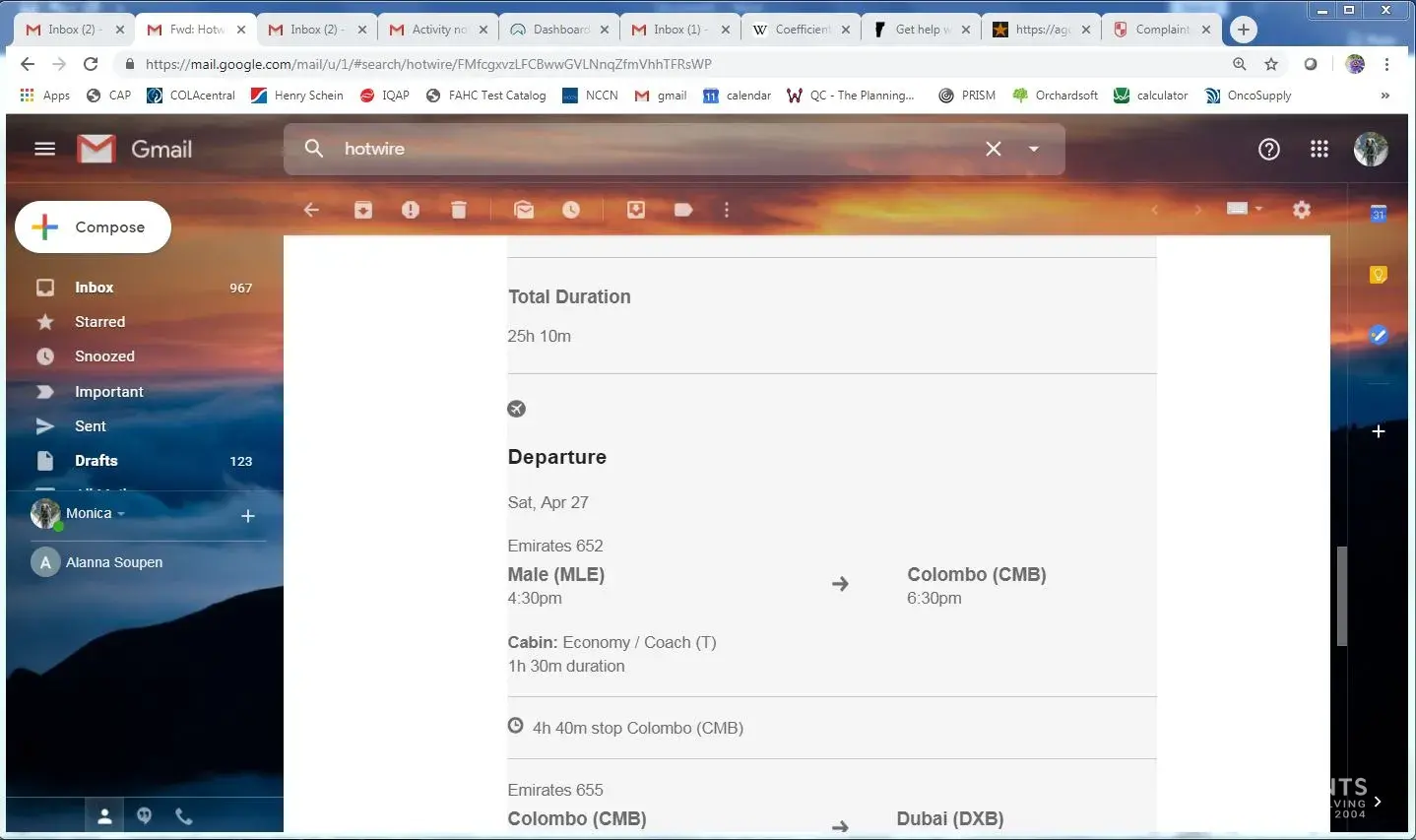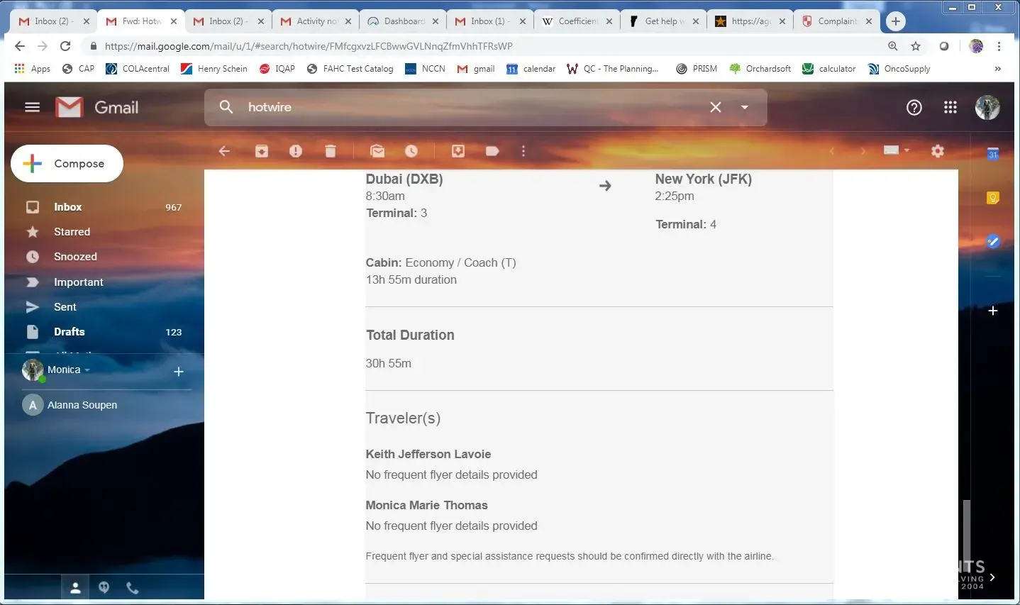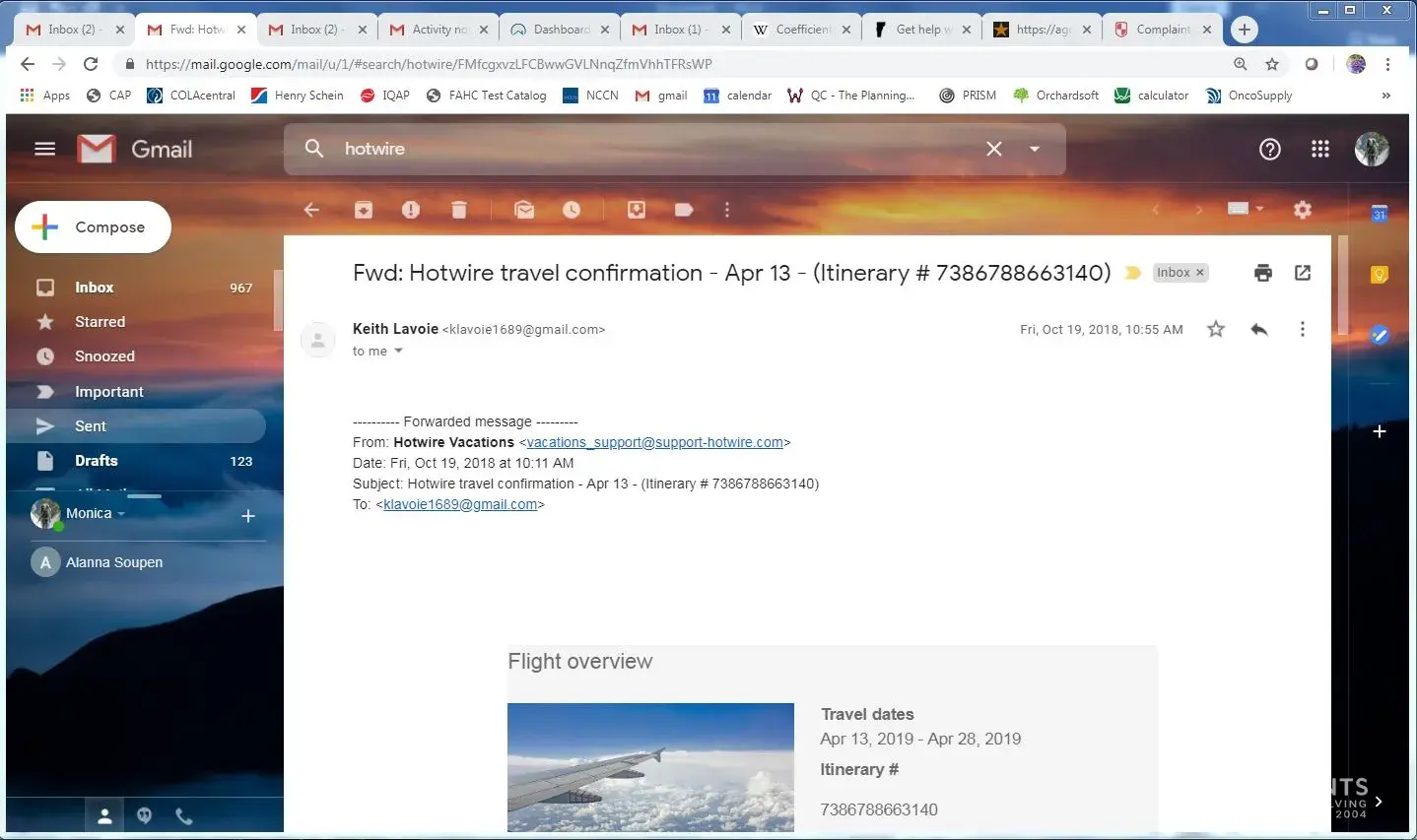 I have an ongoing case under itinerary # [protected]. Phone # associated with the booking is [protected]. Keith Lavoie and Monica Thomas are the customers involved. Last meaningful contact was with Hotwire supervisor Sheryl on 5/17/19.
