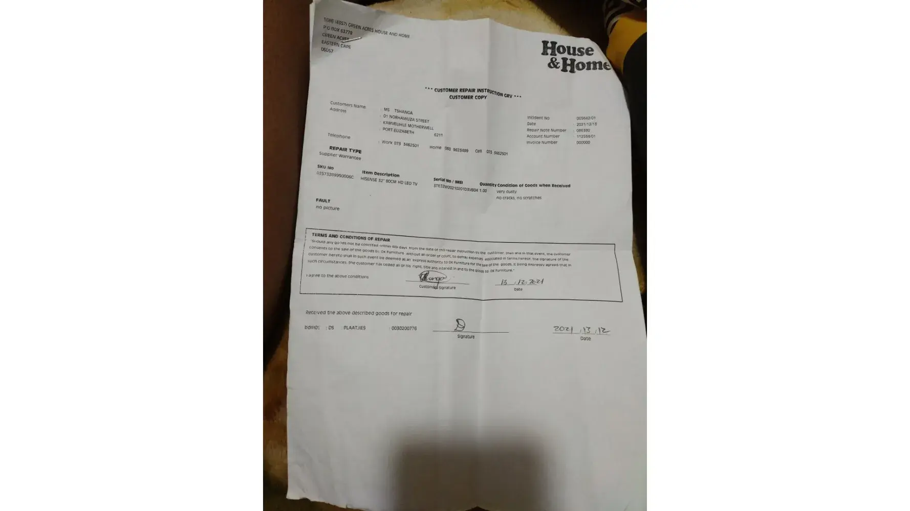 I bought Hisense 32" 80CM Led TV 23/09/2020. Id started giving me problems of the screen being blank and I took it back to the store seems I still have my 2 year guarantee on 13/12/2021 I took it to the store at Greenacres Port Elizabeth for repares and it came back January 2022 it worked properly but near end Feb 2022 it was blank again and I took it to the store first week of March 2022. It's 13th June 2022 and I still haven't recieved my TV or any communication on house ND Home store in greenacres all they tell me is they waiting for parts to repare it and this year November my garuntee end and the TV was with them for 4 month what should I do am not getting any help at all at the store and am frustrated and angry at the poor customer service