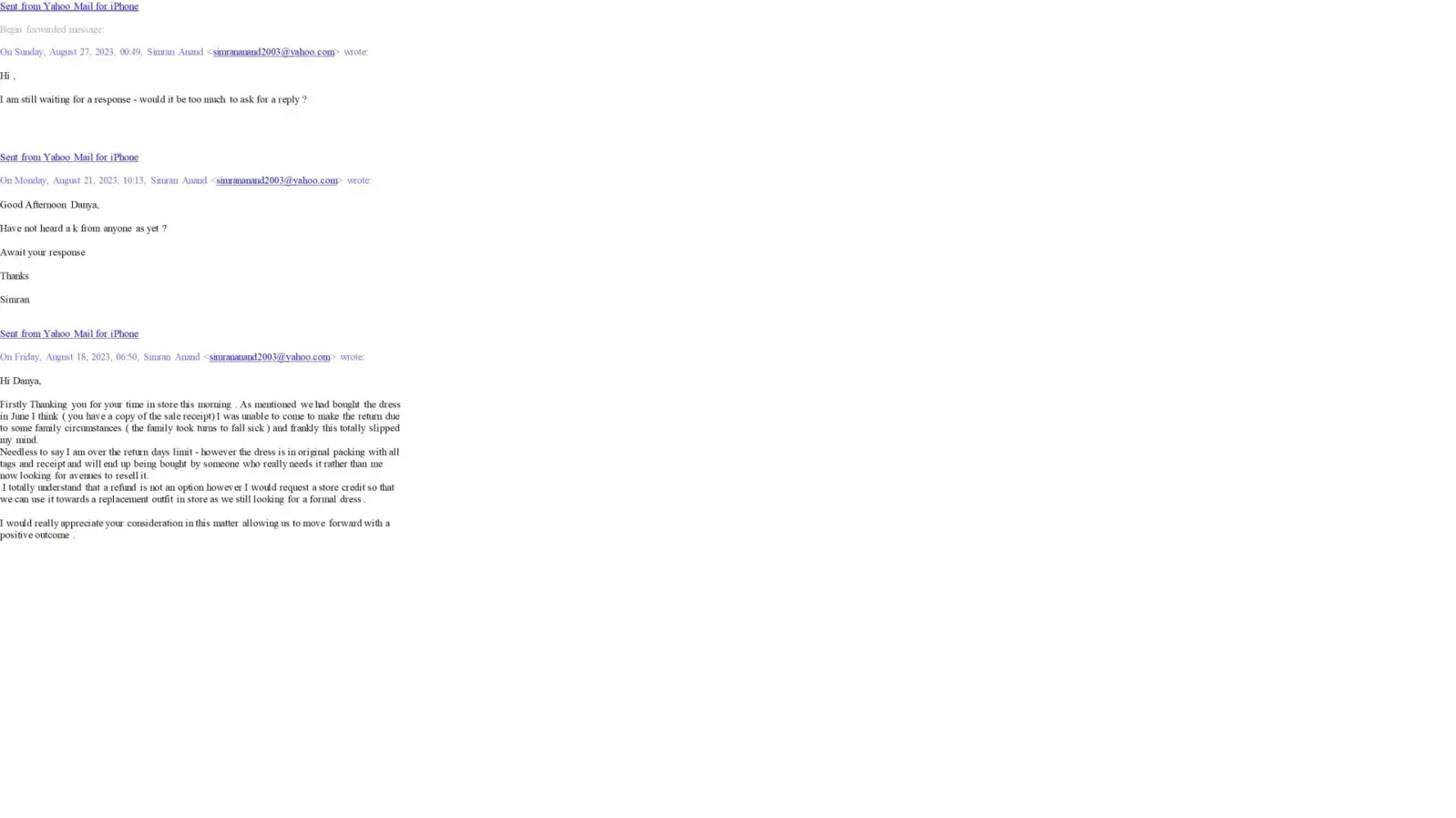 The issue that I have experienced was: This is to do with a return of a formal Dress. I was late in returning the outfit as due to extenuating circumstances (sickness in the family- we are fell sick one after the other me being the last to recover) Once able I went to the David Jones store in Parramatta and explained the situation. I acknowledged that i was over the 60 days, but it was due to the reason mentioned above. The dress was in its original condition with the tags and the receipt of sale. I mentioned it to the Rep at the store that i understand that i am over the 60 days and as such will not get a refund and quite happy just to get store credit so that we could buy another dress as the one we originally chose -though beautiful was not very comfortable ( the school formal event is in September) -I was quite surprised when the manager told me that i was late and maybe i should try and sell the dress online ( marketplace etc) as they would not take it back . It was very shocking that House of CB would have such little pride in their own product that they would prefer the sale to happy through FB market place and suchlike websites Would you not prefer to take your won product back and prefer to sell it from your store rather than having a customer sell it on a 3rd party website specially as the dress was in original and pristine condition in its original wrapping with all tags attached . I was advised that no that was not an option so I requested for details of next person who i could escalate it to. I was then contacted via phone and given the email address of the national manager (email [protected]@houseofcb.com) to write to and explain the situation which i did on the 18th of August 2023, explaining in detail of what had transpired and also acknowledging that i was over the 60 day return policy but it was due to a valid reason. I Never received a response nor acknowledgement of my email. I then send another email follow up on 21st August 2023 and then a 3rd one on 27th August 2023- Disappointing that someone at a national level did not even bother to acknowledge the email or respond back.