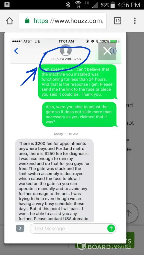 personal cell phone number displaying in houzz.com in a review